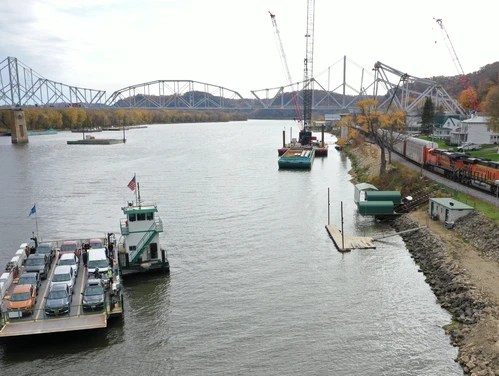 The ferry operates seven days a week from its Wisconsin landing at the western end of WI Hwy 82 adjacent to the bridge construction site, to its Iowa landing at the Lansing Marina upstream from the bridge.